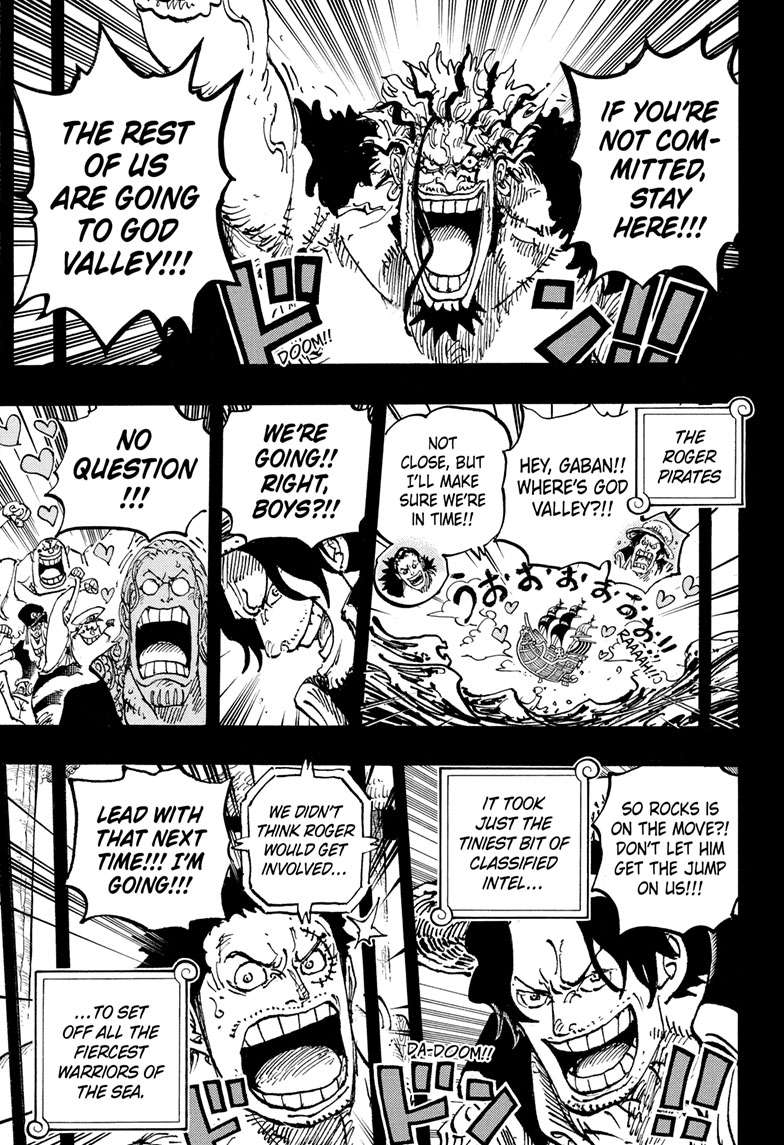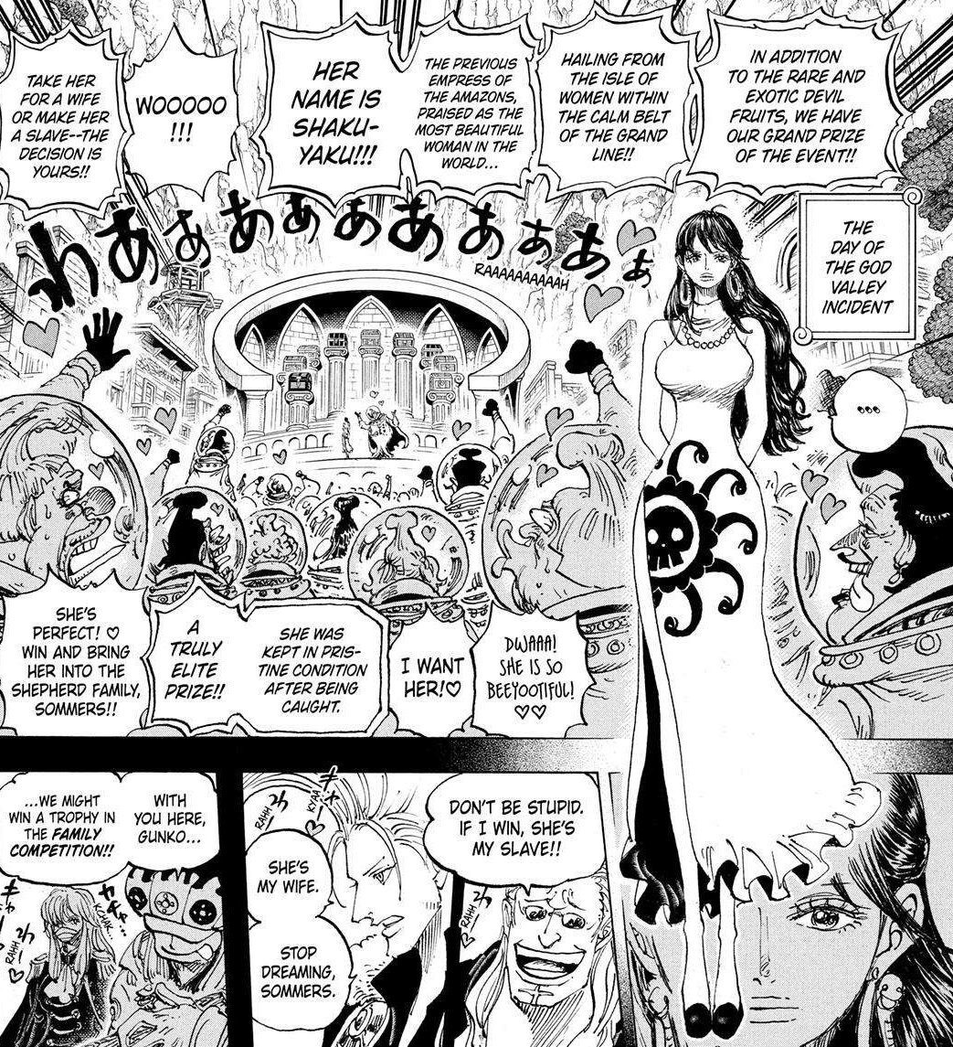 Keeping with Dragon, I guess he’s the one who hid Shanks in a chest seeing as he found the dying Baby Momma. Shamrock wasn’t so lucky I guess. Also, God Valley may explain why Dragon’s devil fruit is so powerful if he ate one of the prized devil fruits to be given to the winners of the human hunt. Finally! We could know what exactly is Dragon’s power!