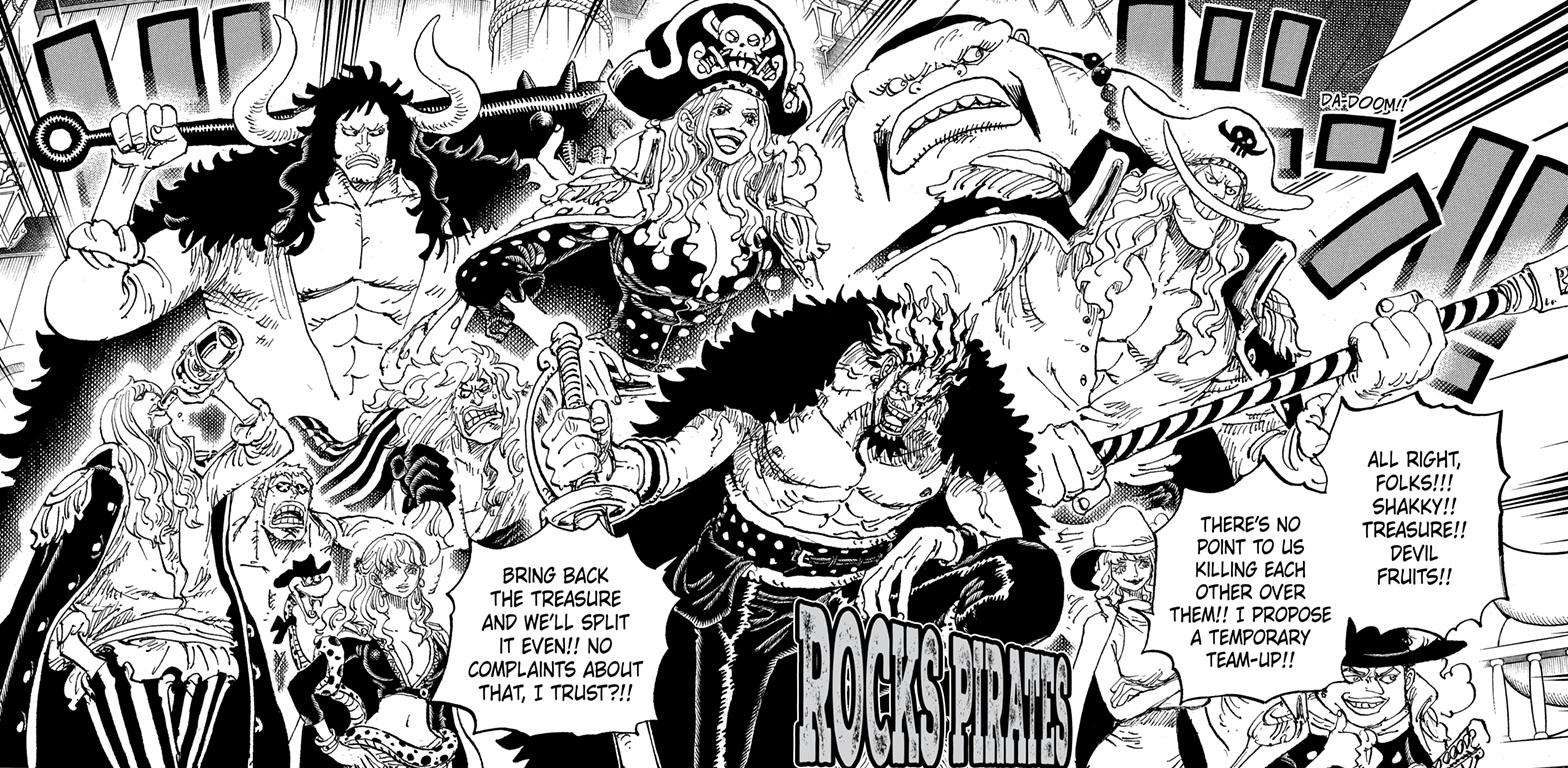So, yeah. We’re in full-blown Disneyland with guns mode for the elite one-percent when the Rocks Pirates show up wanting to save Shakky and steal treasure. Nice seeing pirates act like friggin’ pirates for once. Well, except for Rocks D. Davy or Davy. D. Letterman or whatever he calls himself nowadays. He wants to save his family. Take a lesson from Yasopp: Go out for milk, get some dreadlocks, and never come back.