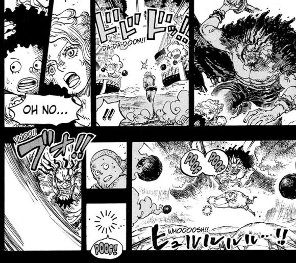 MVP Kuma saving Eris and Teech at the last second was awesome! Now, Imu thinks they’re dead (Just in the flashback. In the present, it looks like the Five Elders learned Blackbeard’s a Davy from St. Saturn’s short conversation with Catarina Devon and Van Augur on Egghead Island). Now, all of the last surviving Davy Clan family are under Imu’s scary demonic control. Eek!